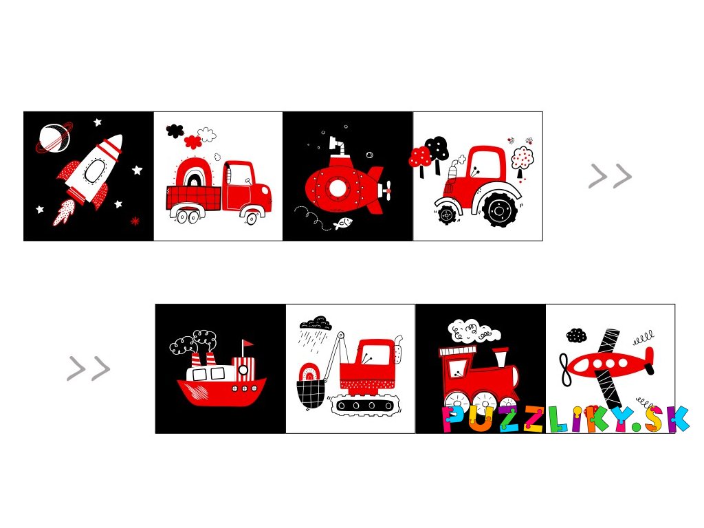 Dopravné prostriedky v čiernobielych farbách na ušitie prvej loptičky / prvého míčku/balónku. Motív: černobílý, čiernobiely, čierno-biely, černo-bílý Gramáž 150g/m2 s...